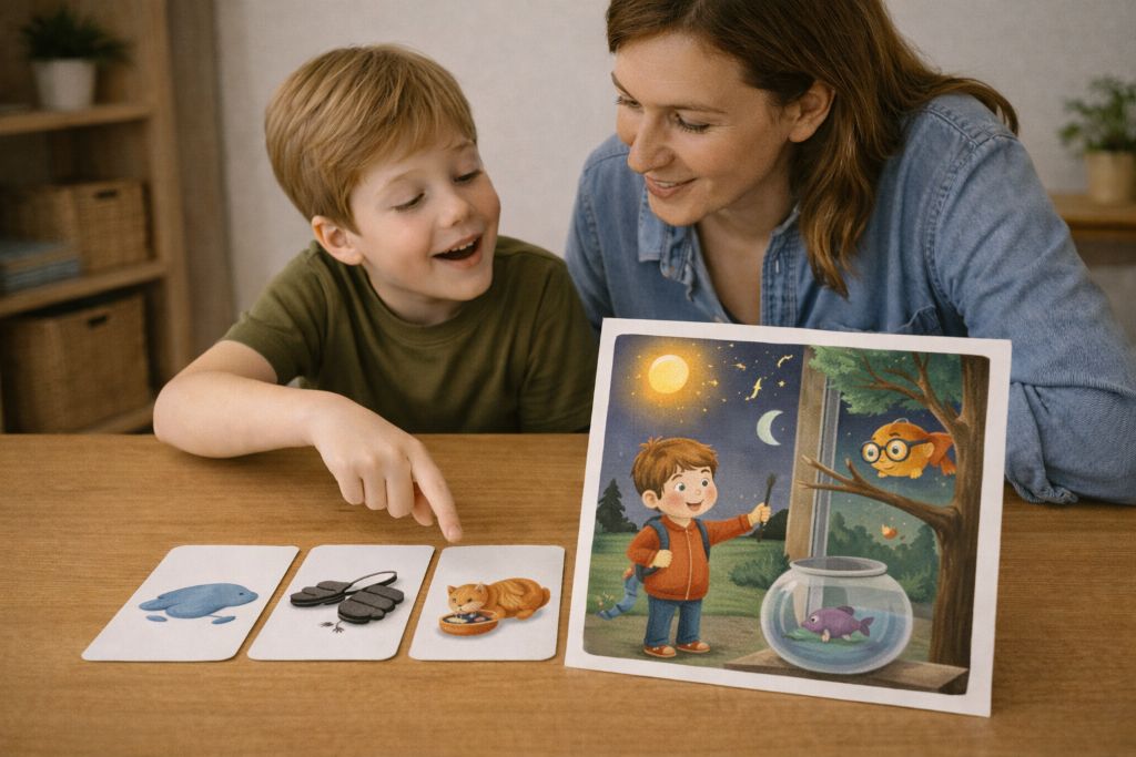 Например: «Птичка не может сидеть под водой — давай посадим её на ветку, а в воде оставим рыбку».