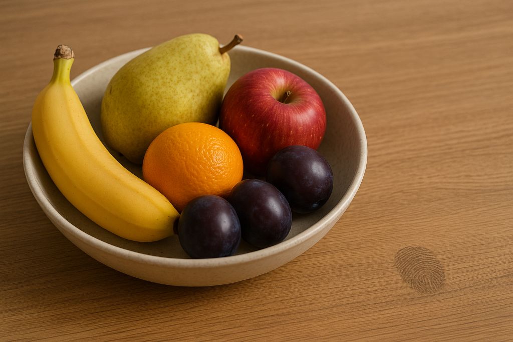 На столе лежали яркие фрукты: красное яблоко, жёлтый банан, оранжевый апельсин и зелёная груша. Всё было на месте, но стоило отвернуться всего на минутку — и вдруг один фрукт пропал! Кажется, кто-то хорошо поужинал… или просто сыграл с тобой в загадку.