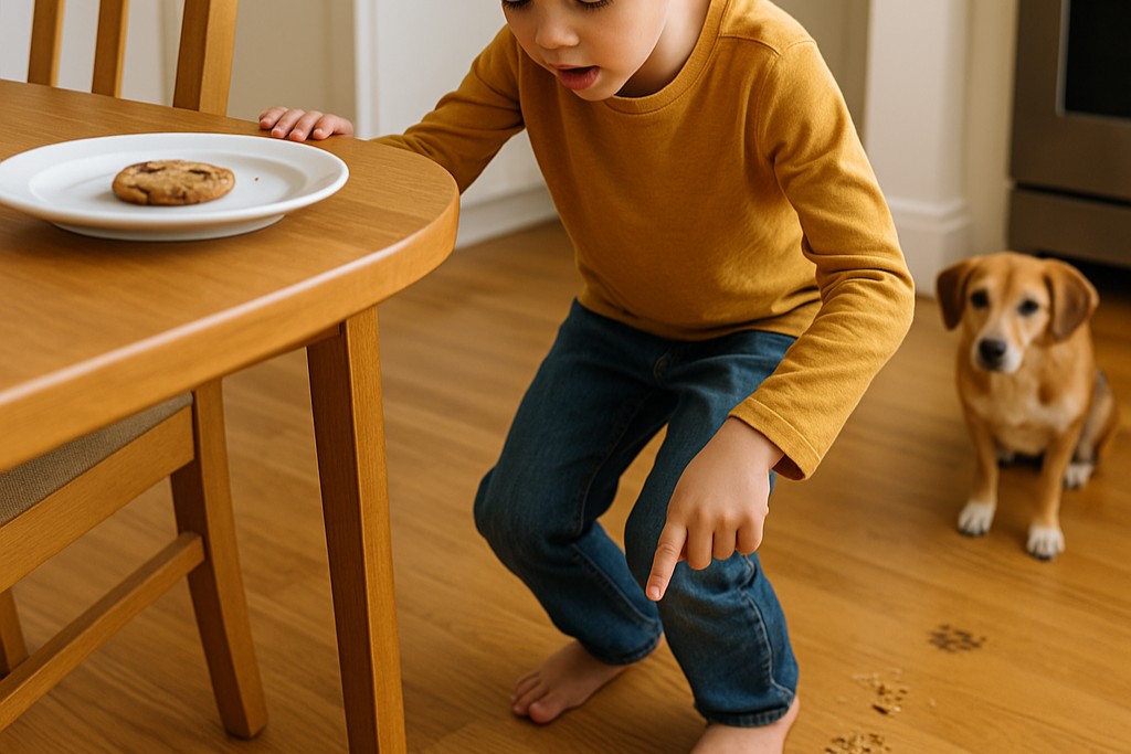 На тарелке лежало три печенья — и вдруг осталось одно. Никто «ничего не брал», но на столе крошки, стул отодвинут, а на полу что-то блестит. Такая маленькая «тайна» — отличный повод сыграть в игру «кто забрал печенье?» и научиться собирать подсказки как настоящий детектив.