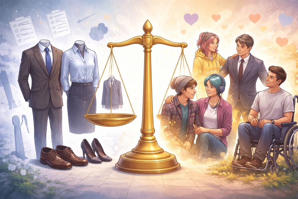 Этика задаёт другой фокус: что мы считаем уважительным отношением к человеку. Можно соблюдать дресс-код идеально и при этом быть токсичным, унижать коллег, шутить над внешностью или исключать «не таких». И наоборот: человек может нарушить правило одежды (по бедности, состоянию здоровья, культурным причинам, религиозным нормам, нейроотличиям), но заслуживает уважения и справедливого отношения.