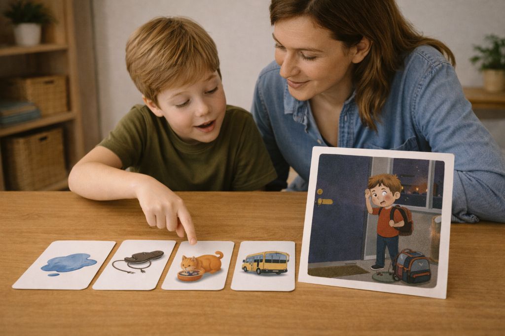 На картинке герой стоит у двери: портфель раскрыт, волосы растрёпаны, а за окном уже темно. Под картинкой вопрос: «Почему он опоздал?» Рядом — несколько маленьких рисунков: лужа, сломанный шнурок, кот у миски и автобус, который уезжает. Задача ребёнка — собрать из них историю. Это не просто игра, а тренировка мышления во времени.