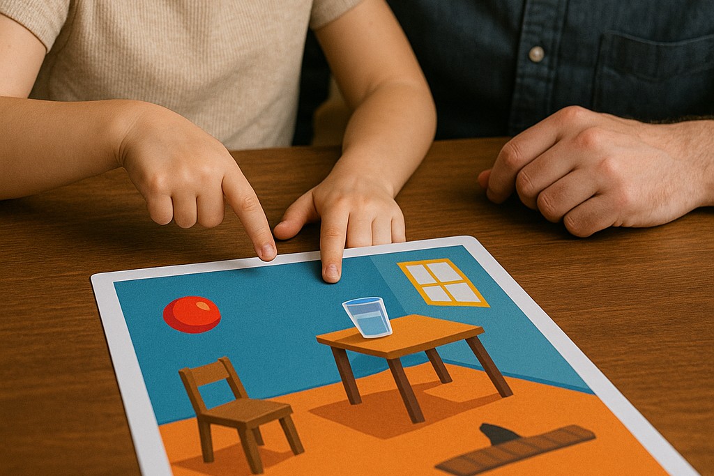 На картинке стакан стоит прямо на воздухе, мяч летит не по дуге, а по ровной линии, а тень от стула падает в другую сторону, чем тень от стола. Выглядит забавно, но что-то не так. Такие задания — отличный повод сыграть в «угадай ошибку» и познакомиться с правилами, по которым живут предметы вокруг нас.