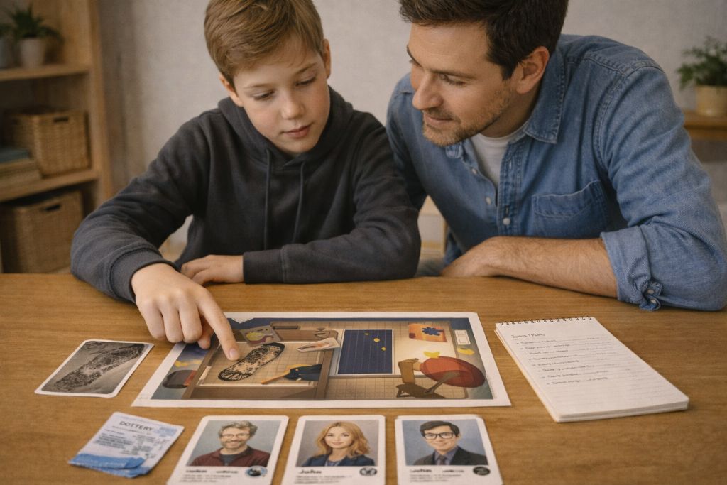 На столе — схема комнаты, карточки с уликами: отпечаток обуви, смятый билет, кружка с недопитым чаем. Рядом три подозреваемых с короткими досье. Задача проста и сложна одновременно: собрать пазл и решить, кто из них врёт. Такая игра даёт подросткам шанс почувствовать себя детективами — без настоящей опасности, но с очень реальной тренировкой мозга.