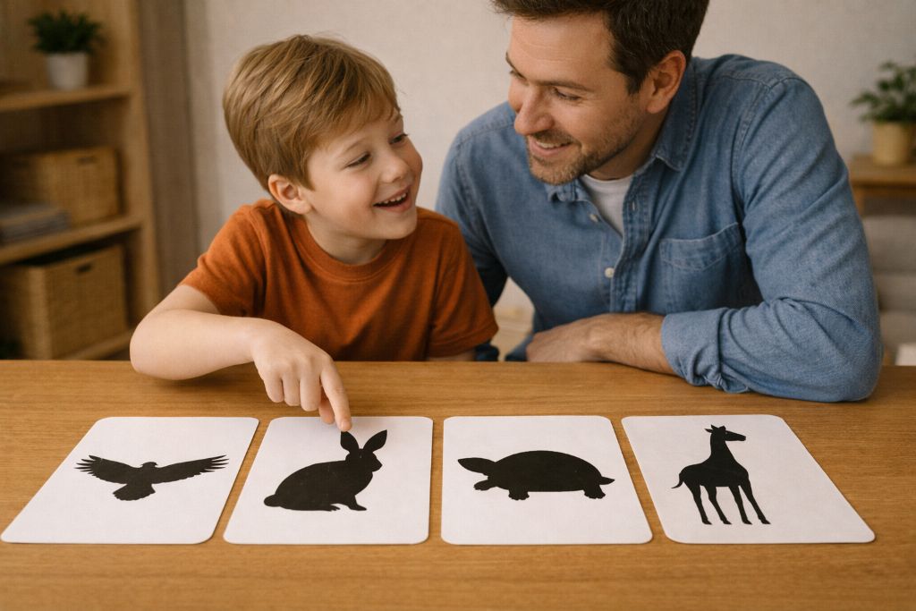 На картинке только тёмный силуэт: длинные уши, круглый живот или огромные крылья. Ни глаз, ни окраса, ни пятен. И всё равно ребёнок может сказать: «Это заяц!» Игра «Угадай животное по тени» показывает, как наш мозг узнаёт знакомых зверей почти вслепую.